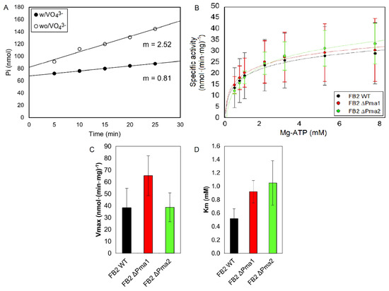 Figure 2. Ustilago maydis plasma membrane ATPase activity. U. maydis wild-type and mutant strains were grown for 24 h in YPD media. Cells were harvested and the plasma membrane was isolated as described in Materials and Methods. ATPase activity was measured in the presence or absence of orthovanadate, and the vanadate-sensitive ATPase activity was measured at different concentrations of the substrate Mg-ATP. Vmax and Km values were obtained by fitting the data to the Michaelis–Menten equation. Inorganic phosphate released from ATP by the plasma membrane H+-ATPase was measured, in accordance with Fiske and Subbarrow [27]. The specific activity is reported as nmol Pi·(min·mg protein)−1. (A). Time course of phosphate production by the plasma membrane H+-ATPase in the presence or absence of 100 μM orthovanadate and 0.5 mM Mg-ATP. (B). Variation of ATPase activity with Mg-ATP concentration. (C). Maximum velocity values. (D). Michaelis–Menten constant values. One-way ANOVA analysis was performed and no statistically significant difference was found between strains using p < 0.05 (n ≥ 3). Bars represent the standard error of the mean; m: Slope.