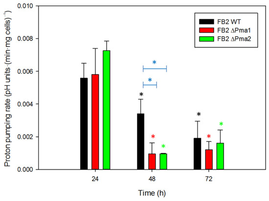 Figure 3. Ustilago maydis proton pumping rate. U. maydis wild-type and mutant strains were cultured in YPD media, and cells were collected at 24, 48, and 72 h to measure the acidification of the external medium. Proton pumping activity is expressed as pH units·(min·109 cells)−1. One-way ANOVA analysis was performed and a statistically significant difference (p < 0.05) was found between times (black, red, and green asterisks) and between wild-type and mutant strains at 48 h (blue asterisks) (n ≥ 3). Bars indicate standard deviation.
