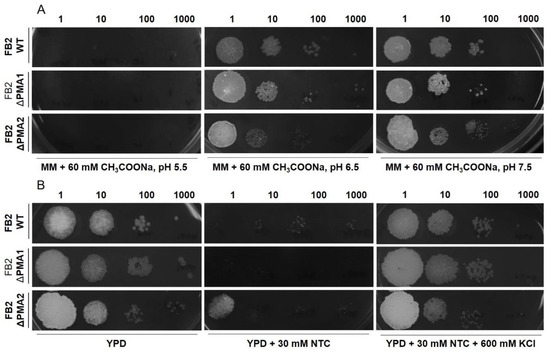 As the proton pumping capacity in mutant strains can be a limiting factor for cell survival under stress conditions, we decided to test different types of stress. In accordance with the weak-acid theory [46], protonated and uncharged acetic acid can diffuse across the plasma membrane. Deprotonation of acetic acid inside the cell will decrease the cytosolic pH, and plasma membrane H+-ATPases are responsible for the extrusion of protons. In this context, it has been demonstrated that the yeast H+-ATPase activity level is an important factor for acid stress tolerance [8,47,48]. Moreover, S. cerevisiae mutant strains lacking Ptk2p, a protein-kinase that activates Pma1p, are not able to grow in media supplemented with 0.12 M CH3COONa [24]. Therefore, defects in the proton pump will result in intracellular acidification and growth inhibition. We did not find differences between wild-type and mutant strains growing at pH values of 5.5, 6.5, and 7.5 in the presence of 60 mM acetic acid, suggesting that the H+-ATPase capacities are comparable in all strains. Similarly, we did not observe differences in the generation of the plasma membrane electrical potential in wild-type and mutant strains, pointing to similar activities of the H+-ATPases at the membrane.