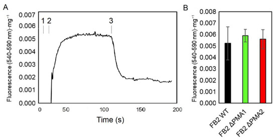 U. maydis sporidia were electroporated as reported by Peña et al. [28]. Sporidia suspension was placed in an electroporation cuvette containing 2.8 mM pyranine. In addition, a pulse was applied at 1500 V, 25 µF, and 200 Ω for 3.0 ms with a BioRad Gene Pulser. Next, electroporated sporidia were washed, resuspended in distilled water, and incubated in 10 mM MES buffer (adjusted to pH 6.0 with triethanolamine) in a final volume of 2 mL. Glucose (10 mM), KCl (10 mM KCl), and CCCP (4 μM) were added at the indicated times. Changes in pyranine fluorescence were measured at 460–560 nm as described by Calahorra et al., 1998 [29] in a DMX-1000 spectrofluorometer (SLM Instruments; Urbana, IL, USA) with a cell compartment thermostat at 30 °C and a magnetic stirrer, connected to an acquisition system. Moreover, 100 mM NH4OH and 100 mM propionic acid were added to reach the maximum and minimum fluorescence values, respectively, to calculate the pH values, in accordance with the Henderson–Hasselbalch equation [28].