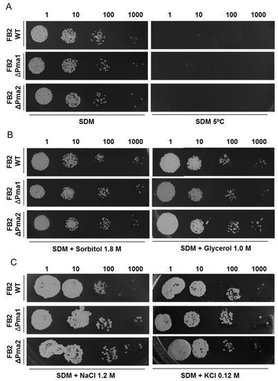 Figure 6. Effect of cold, salt, and osmotic stress on wild-type and mutant strains lacking Pma1 or Pma2. U. maydis wild-type and mutant strains were cultured in SDM for 48 h to determine the effect of thermic (5 °C) (A), osmotic (sorbitol and glycerol) (B), and salt stress (NaCl and KCl) (C) on cell growth (n ≥ 3).