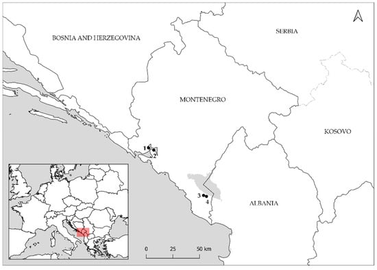 Figure 1. Locations of four sampled Cryphonectria parasitica populations in Montenegro: 1 = Bay of Kotor–Kostanjica (BK-K), 2 = Bay of Kotor–Stoliv (BK-S), 3 = Lake Skadar–Koštanjica (LS-K), 4 = Lake Skadar–Ostros (LS-O). Red rectangle on the map of Europe shows the area of interest.