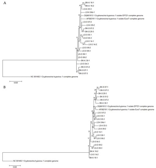 55. Krstin, L.; Katanić, Z.; Repar, J.; Ježić, M.; Kobaš, A.; Ćurković-Perica, M. Genetic diversity of Cryphonectria hypovirus 1, a biocontrol agent of chestnut blight, in Croatia and Slovenia. Microb. Ecol. 2020, 79, 148–163. [Google Scholar] [CrossRef] [PubMed]