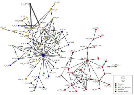 Figure 3. Haplotype network with 561 nt long Cryphonectria hypovirus 1 sequences from the ORF-A region of the genome. Circle sizes correspond to the number of isolates sharing the same consensus sequence. Isolates from Montenegro are represented with orange, from Croatia with blue, from Bosnia and Herzegovina with green and from North Macedonia with red. Reference laboratory strains EP713, EP721 and Euro7 are represented with black. The bars indicate the number of single-nucleotide mutations separating two sequences.