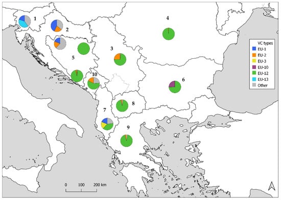 Figure 4. Two most abundant vegetative compatibility (vc) types of Cryphonectria parasitica in different countries on Balkan Peninsula, based on previously published data for Slovenia (1) [33], Croatia (2) [44], Serbia (3) [42], Romania (4) [19,47,48], Bosnia and Herzegovina (5) [45], Bulgaria (6) [47], Albania (7) [43], North Macedonia (8) [46], and Greece (9) [21,46], and data from this research for Montenegro (10).