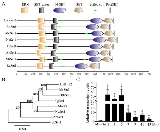 By BLASTp with Neurospora crassa Set1 (XP_961572.3), the Kmt2 homologs, including Ustilaginoidea virens Kmt2 (XP_042996622.1), Beauveria bassiana Kmt2 (XP_008600524.1), Magnaporthe oryzae Set1 (XP_003715029.1), Neurospora crassa Set1 (XP_961572.3), Fusarium graminearum Set1 (XP_011327217.1), Aspergillus nidulans Set1 (XP_663399.1), Metarhizium robertsii Set1 (XP_007823015.2), and Saccharomyces cerevisiae Set1 (NP_011987.1) were hit. Functional domain analysis using the SMART tool (http://smart.embl-heidelberg.de, accessed on 19 October 2021) revealed that all these Kmt2 homologs contain five domains, including RRM, SET_assoc, N-SET, SET, and PostSET. Among these domains, the RRM domain is responsible for RNA recognition, and the SET domain possesses histone methyltransferase activity (Figure 1A). Furthermore, a phylogenetic tree of Kmt2 homologs constructed using the MEGA 7.0 software showed that UvKmt2 is most similar to the M. robertsii Kmt2 (Figure 1B). These results suggested that Kmt2 is highly conserved and may serve as a histone methyltransferase in U. virens as other organisms (Figure 1B).