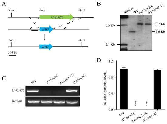 To create the deletion mutants of UvKMT2, a gene replacement strategy was used in this study [35]. Briefly, approximately 1 Kb of 5′ UTR and 3′ UTR regions of UvKMT2 were amplified from the genomic DNA of the WT strain and ligated sequentially to the flanking of hygromycin resistance gene cassette in the pFGL821 (Addgene, 58223, Watertown, MA02472, USA). The resultant plasmid pFGL821-UvKMT2 was introduced into the WT strain by Agrobacterium tumefaciens-mediated transformation (ATMT). The correct transformants were verified by PCR, qRT-PCR, and Southern blot assay (primers listed in Table S1) [35].