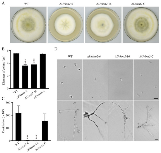 Since the colonies of ∆Uvkmt2 mutants looked smaller than that of the WT strain, mycelial growth was measured by inoculating mycelial plugs of the WT, ΔUvkmt2-6, -16, and ΔUvkmt2-C on the PSA (potato sucrose agar medium) plates for 14 d. Compared with the WT, ΔUvkmt2-6 and 16 were reduced in colony diameters (Figure 3A,B). In contrast, the mycelial growth defect of ∆Uvkmt2 was rescued in the ΔUvkmt2-C strain (Figure 3A,B). These results indicated that UvKMT2 is required for the fungal growth in U. virens.