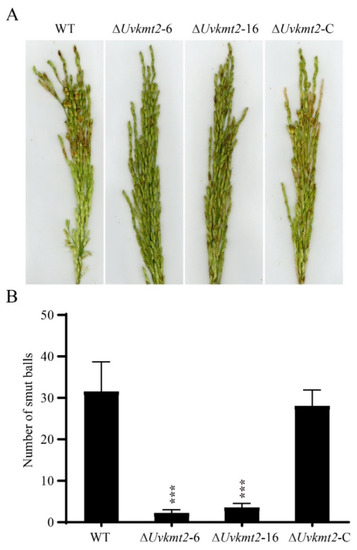 The highly reduced formation of secondary spores may lead to the pathogenic defects in the ∆Uvkmt2 mutant. To determine whether UvKMT2 is required for the virulence of U. virens, the conidial suspensions of the WT, Δuvkmt2-6 and -16, and complemented strains were injected into the booting-stage panicles of susceptible rice plants, Wanxian 98 (Oryza sativa L. indica), respectively. After 21 d of incubation, the ΔUvkmt2-6 and -16 developed a few false smut balls (approximately five) on each inoculated panicle (Figure 4A,B). In contrast, approximately 30 diseased grains with false smut balls were found on each spike inoculated with the WT strain. Moreover, the reintroduction of UvKMT2 restored the pathogenicity to the WT levels. These results indicated that UvKMT2 plays an important role in the fungal virulence in U. virens.