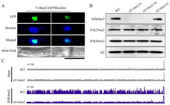 UvKmt2 is essential for establishing H3K4me3 modification. (A) Confocal microscopy-based subcellular localization of UvKmt2 fused with GFP. The GFP signal co-localized with Hoechst-stained nuclei. Scale bar = 5 μm. (B) Deletion of UvKMT2 resulted in loss of H3K4me3 modification. Total nuclear proteins of WT, ΔUvkmt2, and complemented strain ΔUvkmt2-C were isolated to detect histone modification. Immunoblot assay were performed using H3, H3K4me3, H3K27me3, and H3K36me3 antibodies. (C) Genome browser views of H3K4me3 in the WT and ∆Uvkmt2 mutant. H3K4me3-marked genomic sequences in the WT and ΔUvkmt2 were immunoprecipitated with H3K4me3 antibodies and then sequenced. The H3K4me3 enrichment was presented in the WT and ΔUvkmt2 strains. Similar results were obtained from two biological replicates.