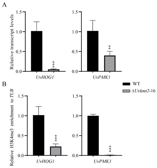 In addition, two important mitogen-activated protein kinase UvHOG1 (Uv8b_1888) and UvPMK1 (Uv8b_2494) genes were significantly down-regulated in the ΔUvkmt2 strain by comparing with the WT (Figure 7A). To verify these RNA-seq results, qRT-PCR assays were carried out. Consistently, the expression levels of UvHOG1 and UvPMK1 in the UvKMT2 deletion mutant were 86% and 55% lower than those of the WT, respectively (Figure 7A). Furthermore, ChIP-qPCR assay showed that the decreased expression of UvHOG1 and UvPMK1 genes in the UvKMT2 deletion is associated with reduced H3K4me3 occupancy (Figure 7B). These results suggested that UvKmt2 participates in the regulation of UvHOG1 and UvPMK1 expression by H3K4me3-mediated activation in U. virens. It was previously shown that UvHOG1 and UvPMK1 are involved in the pathogenicity of U. virens, and UvHOG1 may also be necessary for virulence [36,38]. Therefore, one of the possible reasons for the reduced virulence in the ∆Uvkmt2 mutant is that it was caused by the reduced H3K4me3 modification at the chromatin of UvHOG1 and UvPMK1 genes and the down-regulation of their expression.