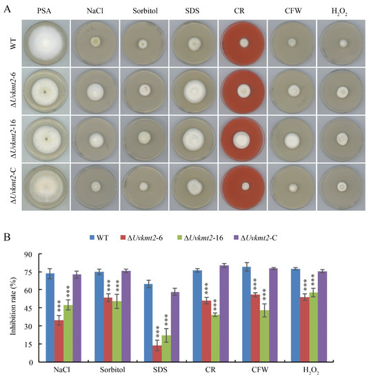 To determine sensitivities to various stresses, vegetative growth of the WT, ∆Uvkmt2 mutants, and complementation strains were observed after being grown on the PSA plates with 0.3 M NaCl, 0.5 M sorbitol, 0.03% SDS, 120 mg/mL CR, 120 mg/mL CFW, or 0.015% H2O2 for 14 d at 28 °C. Images were taken to show the vegetative growth under various stress conditions. The formula of relative inhibition rate was calculated as follow: growth inhibition rate = (diameters of strain colony on the PSA minus diameters of strain colony on the PSA amended with different chemicals)/diameters of the strain colony on the PSA × 100%. The values were represented as the mean ± SD from three independent replicates.