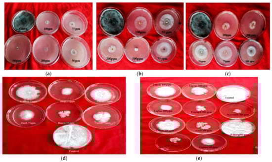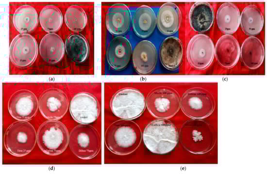 Effect of systemic fungitoxicants on radial mycelial growth of T. harzianum and A. bisporus: (a) thiophanate methyl against T. harzianum; (b) myclobutanil against T. harzianum; (c) carbendazim against T. harzianum; (d,e) Thio (= thiophanate methyl), Myclo (= myclobutanil), Hexa (= hexaconazole), Carben (= carbendazim) and Difeno (= difenoconazole) fungitoxicant against A. bisporus.