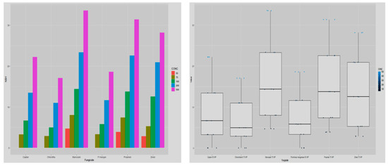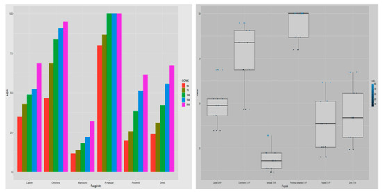 Comparative bar chart (left) and Boxplots (right) describe the effect of non-systemic fungitoxicants under in vitro conditions against T. harzianum mycelium.