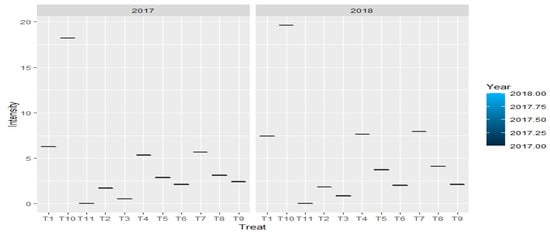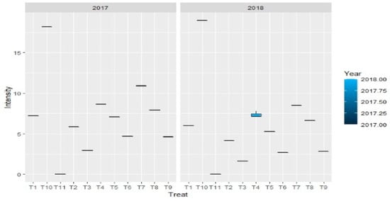 Boxplots depict the impact of systemic fungitoxicants in casing on percent intensity of green mold disease, where T1 = Carbendazim 0.025% conc., T10 = Check I (infested-untreated), T11 = Check II (uninfested-untreated), T2 = Carbendazim 0.05% conc., T3 = Carbendazim 0.1% conc., T4 = Thiophanate methyl 0.025% conc., T5 = Thiophanate methyl 0.05% conc., T6 = Thiophanate methyl 0.1% conc., T7 = Myclobutanil 0.025% conc., T8 = Myclobutanil 0.05% conc., T9 = Myclobutanil 0.1% conc.