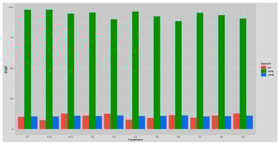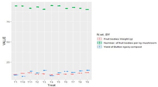 Among different non-systemic fungicides that were used for study, captan showed a minimum number (90.08) of fruit bodies per kg of mushrooms at a concentration of 0.2%, trailed by prochloraz manganese and chlorothalonil at a concentration of 0.2% and captan at a concentration of 0.1% yielding 90.46–91.68 fruit bodies per kg of mushroom, whereas, 94.48 and 91.73 fruit bodies per kg of mushroom were recorded in infested-untreated and uninfested untreated, respectively, as illustrated in Table 5 and Figure 5. With distinct fungicidal treatments, the average fruit-body weight also differed significantly. The maximum (11.54–12.16 g) average single fruit body weight was obtained from polybags with treatment of captan, which was close to that obtained in uninfested-untreated control (11.86 g) at concentrations of 0.1 and 0.2 percent. The next best treatment was prochloraz manganese and chlorothalonil at concentration 0.20%, with mean fruiting weight of 10.52 and 10.24 g, respectively, compared to 11.32 g for the infested-untreated control.