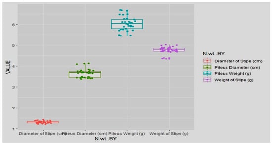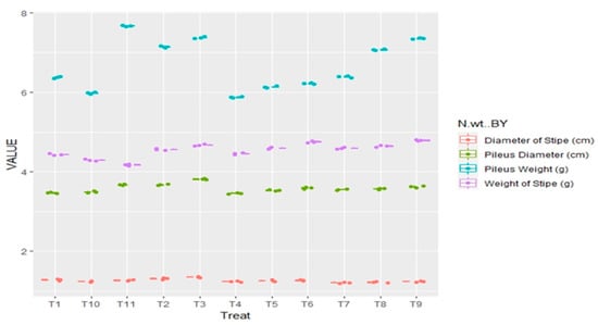 The fungitoxicant impact on the infested casing has greatly afflicted the quality parameters of sporophore, such as diameter of pileus and weight of stipe, although there was no substantial change in the pileus weight and stipe diameter (Table 11, Figure 13).