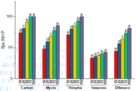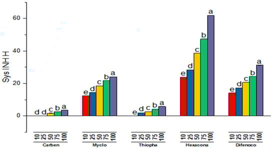 Comparative bar chart designates the effect of systemic fungitoxicants under in vitro conditions on host A. bisporus mycelium, where Carben = Carbendazim 50 WP, Myclo = Myclobutanil 10 WP, Thiopha = Thiophanate methyl 70 WP, Hexacona = Hexaconazole 5 EC, Difenoc = Difenoconazole 25 EC, Sys INHH = mycelial inhibition of host.