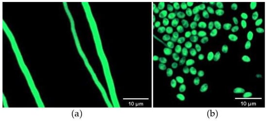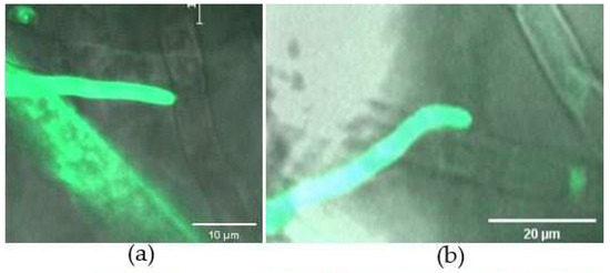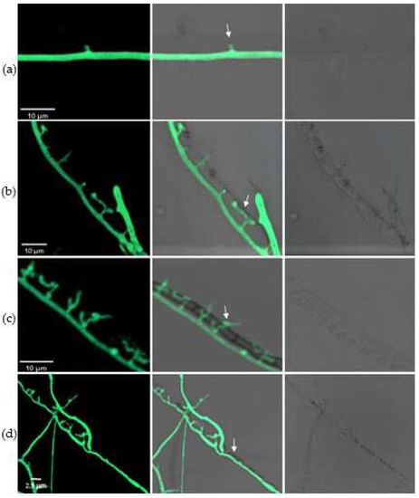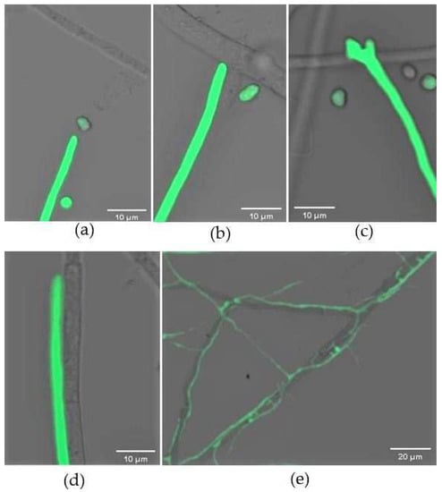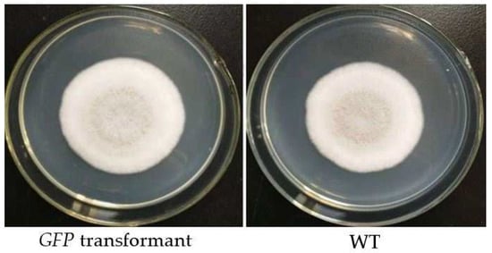 To explore mycoparasitism, interactions between different fungal species are observed by microscopy [15,16,17]. Furthermore, molecular techniques involving constitutive expression of fluorescent proteins can be employed to visualize the associations of mycoparasites and hosts, and their colonization in soil and other non-sterile environments. [18]. In recent decades, the gene-encoding green fluorescent protein (GFP), originally isolated from the jellyfish Aequorea victoria [19], has been widely used as an effective molecular marker in many prokaryotes and eukaryotes without damaging cell activities. For example, GFP was expressed in Trichoderma species, which elucidated their interactions with Pythium ultimum, invasion of the hyphae and sclerotia of Rhizoctonia solani [4,20], and penetration of the plant parasitic nematode Globodera pallida [21]. Using a GFP marker, Németh [22] first visualized Ampelomyces quisqualis, a mycoparasite of powdery mildew, and deciphered its lifestyle in the environment, before and after acting as a mycoparasite.