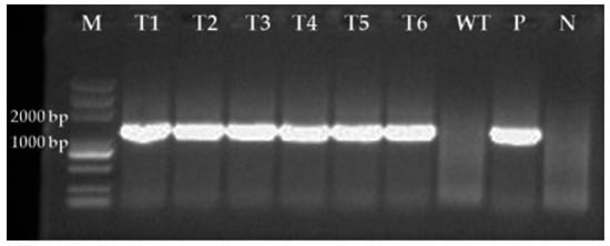 PCR verification of GFP-labelled C. rosea transformants using primers GFPF and GFPR. M, DNA markers; T1−T6, Transformants; WT, Wild-type strain; P, Plasmid; N, Negative control.