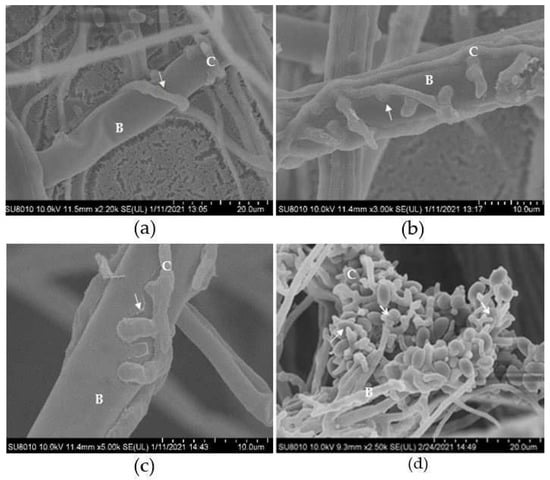 Under an SEM, it could be clearly seen that the hyphae of B. cinerea were tightly wrapped by those of the biocontrol fungus (Figure 6a), and an amount of appressoria generated from the hyphae of C. rosea, by which the mycoparasite penetrated the host cells (Figure 6b). At this point, the cell walls of the pathogen were partially degraded (Figure 6c). In addition to attacking fungal mycelia, C. rosea could also attack B. cinerea spores, and microscopy showed that the newly produced host conidia were penetrated by C. rosea appressoria (Figure 6d).