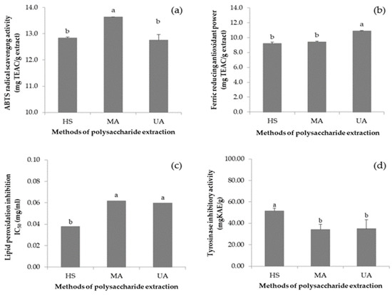 Antioxidant activities of (a) ABTS-radical scavenging activity; (b) FRAP; (c) lipid peroxidation inhibitory; and (d) anti-tyrosinase activities of the VVP by hot water shaking (HS), microwave-assisted (MA), and ultrasonic-assisted (UA). Different lowercase indicates a significant difference (p < 0.05).