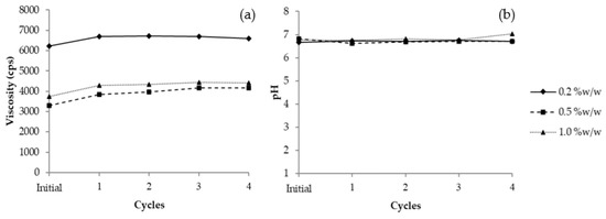 Profiles of VVP gel cream after treatment with 4 cycles of heating–cooling test: (a) Viscosity and (b) pH. The viscosity test used Spindle No. 5, 30 rpm at 25 °C.