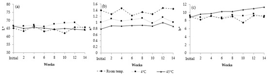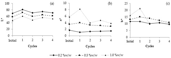 Color profile of polysaccharide formulation after treatment with 4 cycles of heating–cooling: (a) L* values; (b) a* values; and (c) b* values.