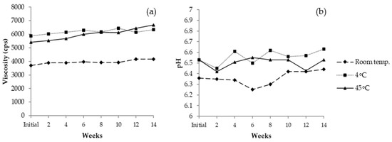 Profiles of polysaccharide formulation after being stored under three conditions for 3 months: (a) Viscosity and (b) pH.
