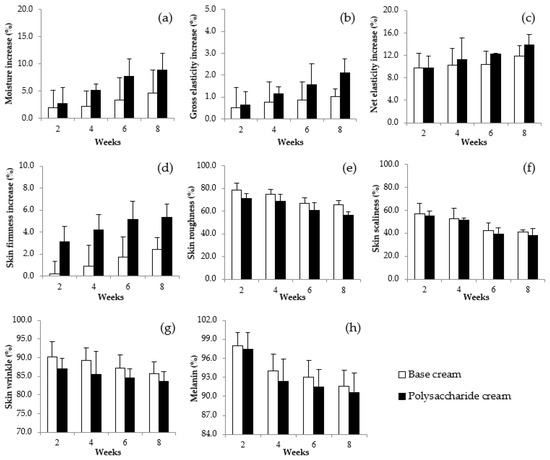 Skin measurement of 20 healthy volunteers after application of the base formula compared to the facial moisturizing gel cream containing mushroom: (a) average moisture increases; (b) average gross elasticity increases (%); (c) average net elasticity increase; (d) average skin firmness increase; (e) average skin roughness; (f) average skin scaliness; (g) average skin wrinkle; and (h) average skin melanin content.