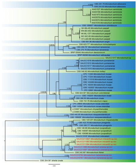In this study, three new pathogenic species in Microdochium were found among samples collected in Hainan Island, China. Two of them were isolated from Miscanthus sinensis Anderss, and a third one from Phragmites australis (Cav.) Trin. ex Steud. Their morphological characteristics and molecular-sequence data are described and discussed below.