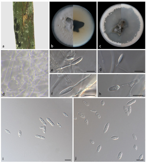 Microdochium sinense (holotype HMAS352154, ex-holotype SAUCC211097). (a) Leaves of host plant; (b) inverse and reverse sides of colony after 15 days on PDA; (c) inverse and reverse sides of colony after 15 days on OA; (d) colony overview; (e–h) conidiophores and conidiogenous cells; (i,j) conidia. Scale bars: (e–j) 10 μm.