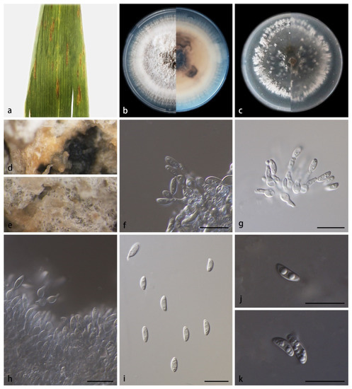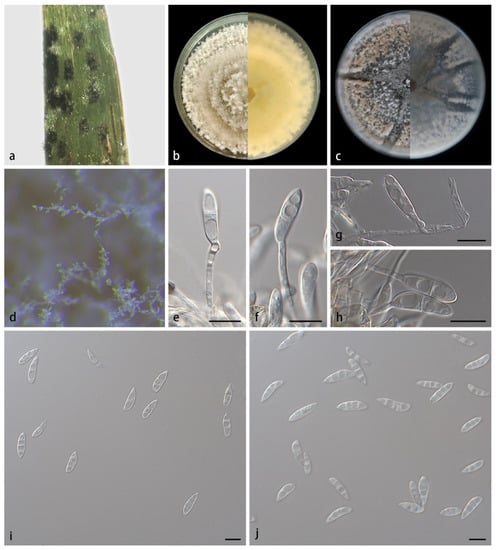 Microdochium miscanthi (holotype HMAS352151, ex-holotype SAUCC211092). (a) Leaves of host plant; (b) inverse and reverse sides of colony after 15 days on PDA; (c) inverse and reverse sides of colony after 15 days on OA; (d) a colony overview; (e–h) conidiophores and conidiogenous cells; (i,j) conidia. Scale bars: (e–j) 10 μm.
