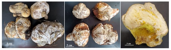 B. griseus is a kind of ectomycorrhizal mushroom, and is symbiotically associated with a large number of trees and shrubs. It can be found along the forest edge of pine-oak mixed forests in Yunnan Province [10]. When sampling, two phenotypes of the sporocarps of B. griseus were found, namely, normal-developed sporocarps (Figure 1) and symbiotic fruiting bodies of B. griseus–mycoparasitic fungus (Figure 2). Owing to the geographical location and ecological, climatic, topographic, and geological factors, Yunnan Province is rich in fungal biodiversity, with more than 882 edible species and an average annual yield of 500,000 tons. Many studies have focused on the resource survey, annual yield, bioactivities and bioactive components, and food safety of wild edible mushrooms [2,11,12,13,14,15,16]. However, few reports have studied the fungicolous fungi and host–parasite relationships in wild edible mushrooms, except for the genus Hypomyces [17,18].
