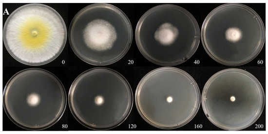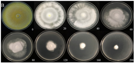 Cadmium tolerance of H. chrysospermus on PDA plates. (A) 5 days; (B) 10 days. Data in the figure indicate Cd2+ concentrations (mg·L−1) in PDA.