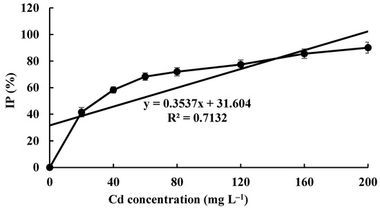 The Cd tolerance of H. chrysospermus was determined on Cd-enriched PDA plates. As shown in Figure 4, H. chrysospermus grew very rapidly when cultured on PDA. When cultured for 5 days on PDA without Cd2+, the diameter of the colonies was 7 cm on average (Figure 4A). Cd significantly inhibited H. chrysospermus. Colonies showed an inverse relationship with the Cd2+ concentrations, and the inhibition percentage showed a direct positive correlation with the Cd2+ concentrations, with R2 being 0.7132. The highest Cd2+ concentration tolerated by H. chrysospermus was 160 mg·L−1. The MIC value of Cd2+ to H. chrysospermus was determined to be 200 mg·L−1, and the EC50 was calculated to be 52 mg·L−1, according to the IP of Cd to H. chrysospermus (Figure 5). However, when cultured for a prolonged time, growing mycelium could be observed on the PDA of 200 mg·L−1, as shown in Figure 4B. Traxler et al. described a similar phenomenon; that is, the growth of Schizophyllum commune was still visible even at the highest metal concentrations used in PDA medium cultivated for 14 days [36].