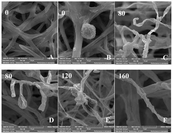 (A–F) Scanning electron micrographs of H. chrysospermums grown for 7 days on PDA with gradually increasing concentrations of Cd2+. Data of 0–160 in the figures indicate the Cd2+ concentrations in PDA (mg·L−1).