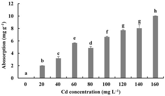 Cd2+ absorption by H. chrysospermus. Different letters indicated significant difference (p < 0.05).