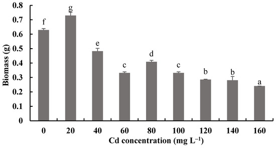 Effects of different concentrations of Cd2+ on the biomass of H. chrysospermus. Different letters indicated significant difference (p < 0.05).