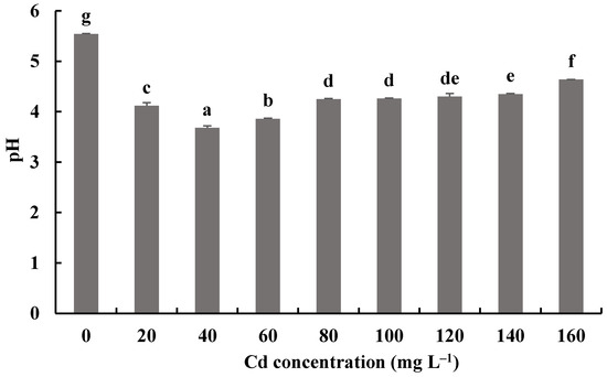 Effects of different concentrations of Cd2+ on the pH of a fermentation mixture of H. chrysospermus. Different letters indicated significant difference (p < 0.05).