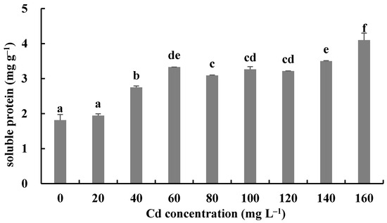 Effects of different concentrations of Cd2+ on soluble protein of H. chrysospermus. Different letters indicated significant difference (p < 0.05).