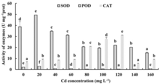 Effects of different concentrations of Cd2+ on the activities of antioxidant enzymes of H. chrysospermus. Different letters indicated significant difference (p < 0.05).