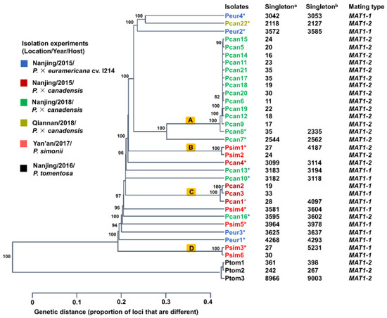 Phylogenetic analysis of 35 M. brunnea isolates. The UPGMA tree was inferred by Poppr with 1000 bootstrap replicates. Different isolation experiments are labeled in different colors. Pcan, P. canadensis of sect. Aigeiros; Peur, P. × euramericana cv. I214 of sect. Aigeiros; Psim, P. simonii of sect. Tacamahaca; Ptom, P. tomentosa of sect. Leuce; Nanjing, 118°77′ E, 32°04′ N; Yan’an, 109°28′ E, 36°36′ N; Qiannan, 107°47′ E, 27°07′ N; Singleton a, singletons identified in the SNP dataset of 35 isolates; Singleton b, singletons identified in the SNP dataset of 19 nonredundant isolates; Asterisk, 19 nonredundant isolates; and mating-type, a single MAT locus identified in genome assembly of each isolate. Clades (A, B, C, and D), redundant clones.
