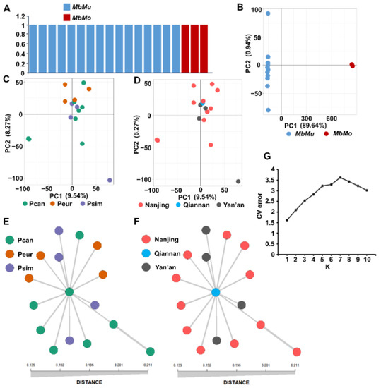 Population structure analysis of M. brunnea isolates. (A) Structure plot inferred by fastSTRUCTURE with the SNP dataset of 19 nonredundant M. brunnea isolates. K = 2. y-axis quantifies cluster memberships. (B) PCA of 19 nonredundant M. brunnea isolates. (C,D) PCA of 16 nonredundant MbMu isolates. The color of the circle corresponds to the hosts (C) and sampling locations (D). (E,F) MSN plots of 16 nonredundant MbMu isolates. The color of the circle corresponds to the hosts (E) and sampling locations (F). (G) Cross-validation (CV) error (y-axis) for K between 1 and 10. The estimation was generated by ADMIXTURE software.
