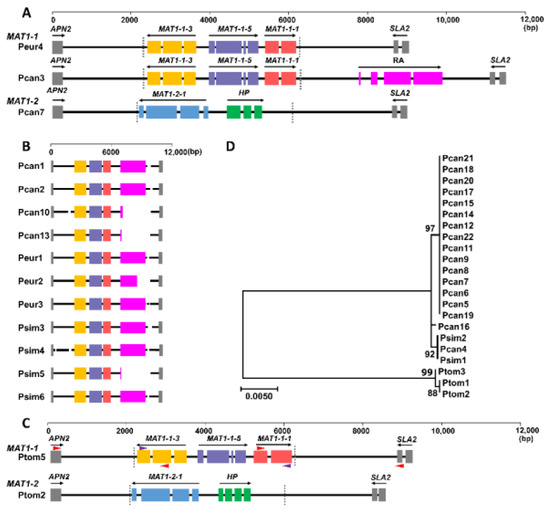 One complete MbMu MAT1-1 locus was found in the Pcan3 assembly, of which a retrotransposon structure, i.e., a gene encoding a complete RNaseH domain of reverse transcriptase (RA), was located in the region between MAT1-1-1 and SLA2 (Figure 4A). The RA was moderately repetitive in the MB_m1 genome, with 17 copies (E-value < 1E-50, identity > 81%). The MAT1-1 loci of 11 MbMu isolates had a gap flanking part of the RA sequence (Figure 4B), indicating that these isolates may also carry RA in their MAT1-1 loci. By contrast, the complete MAT1-1 locus of the Peur4 assembly did not contain any of the RA sequence. Three protein-coding genes were predicted in each MbMu MAT1-1 locus, MAT1-1-1, MAT1-1-3, and MAT1-1-5 (Figure 4A,B).