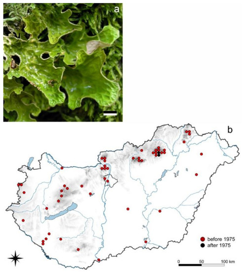 Lobaria pulmonaria (a) habit (scale 1 cm); (b) its distribution in Hungary (94 records). Dots represent c. 5 km × 6 km areas. (Photo: L. Lőkös).