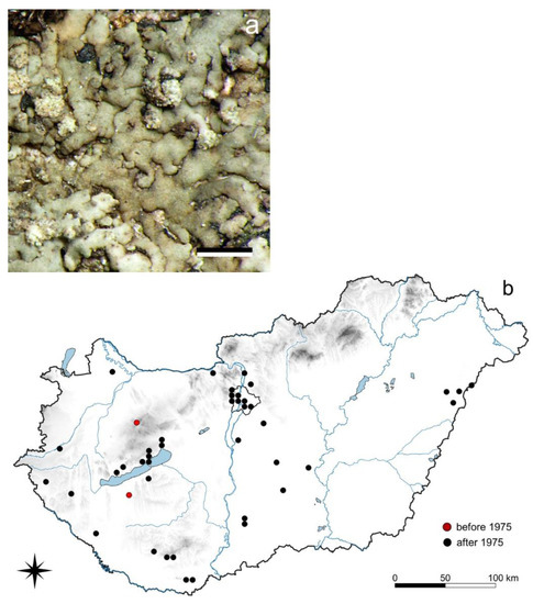 S. candicans has a pale grey, thickly white-pruinose, placodioid, rosette-like thallus and dark brown to black apothecia (Figure S3). Two old localities were known from the Buda Mts (1934) and the Balaton Upland (1947). Between 2007 and 2015, it was found at several localities in the Balaton Upland and the Buda Mts predominantly on calcareous rocks and also on geyserite near Tihany [69].