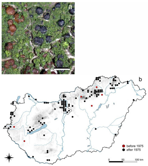 Scoliciosporum chlorococcum (a) habit (scale 0.5 mm); (b) its distribution in Hungary (322 records altogether). Dots represent c. 5 km × 6 km areas. (Photo: E. Farkas).