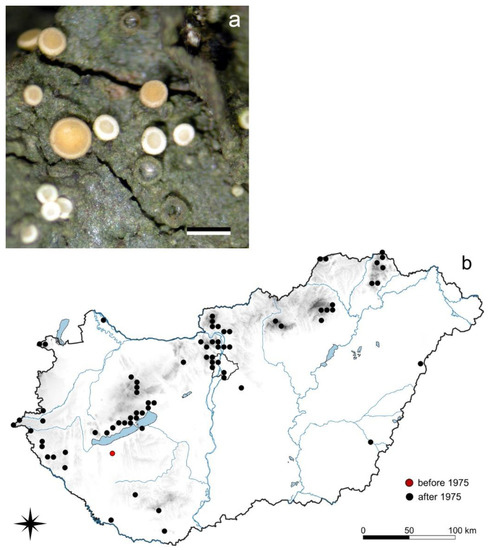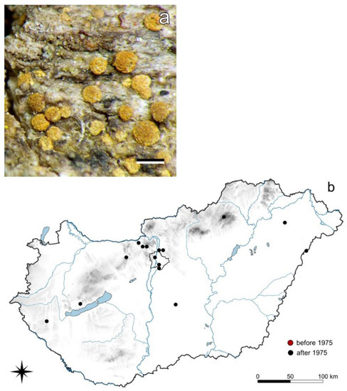 Piccolia ochrophora (a) habit (scale 0.5 mm); (b) its distribution in Hungary (16 records). Dots represent c. 5 km × 6 km areas. (Photo: E. Farkas).