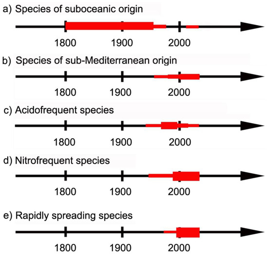 In comparing the various distribution maps based on historical and recent records by studying (1) the direction of changes, (2) the possible environmental changes, and (3) the ecological indicator values by Wirth [75], the following explanation for the various groups can be suggested (Figure 6).